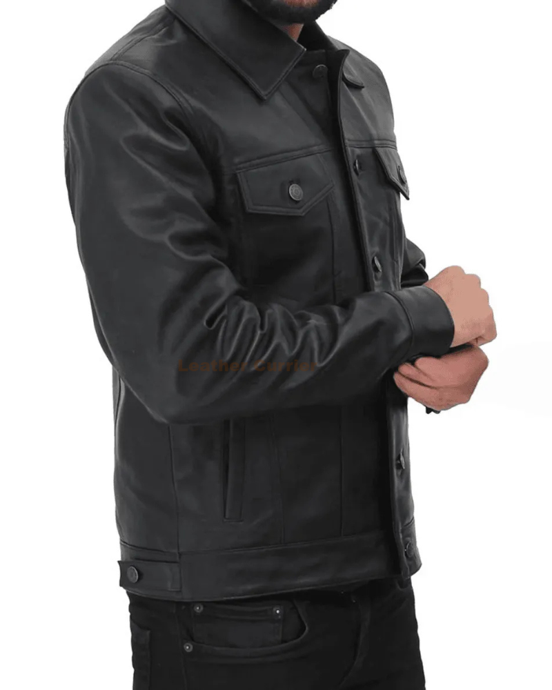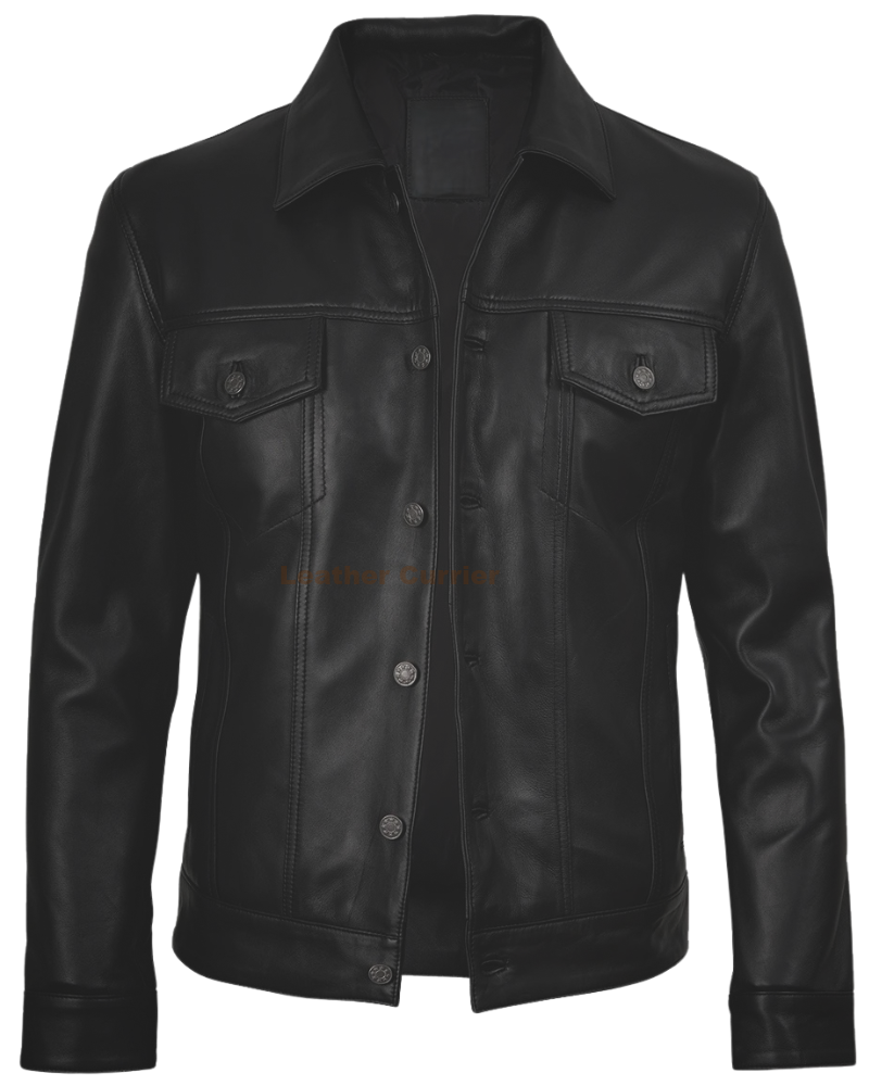 The Fernando Black Trucker Leather Jacket gives the classic trucker silhouette a bold upgrade in full-grain leather. With its shirt-style collar and structured fit, it’s a perfect mix of rugged charm and timeless elegance.