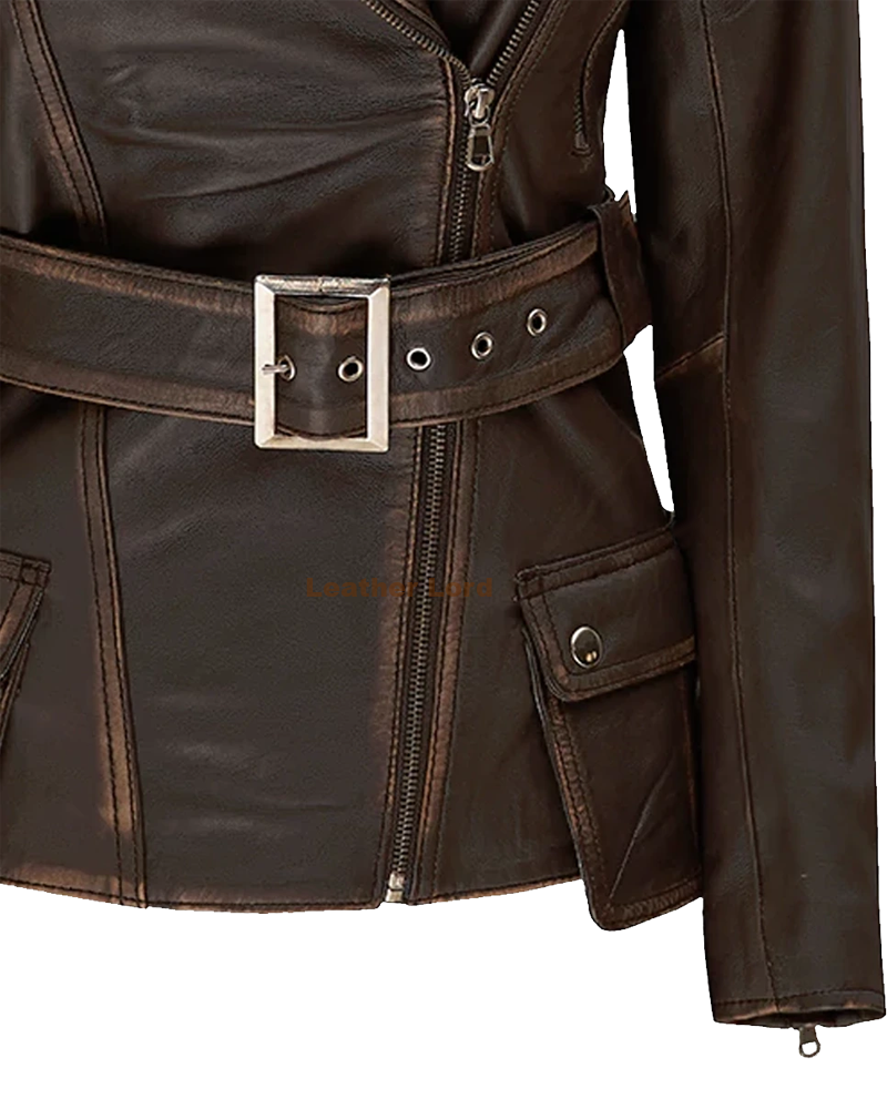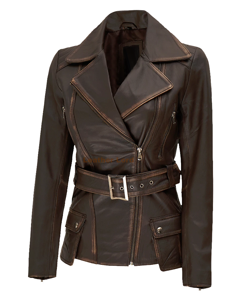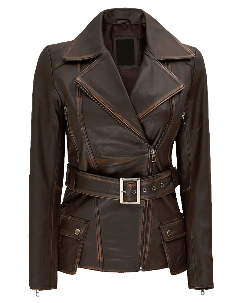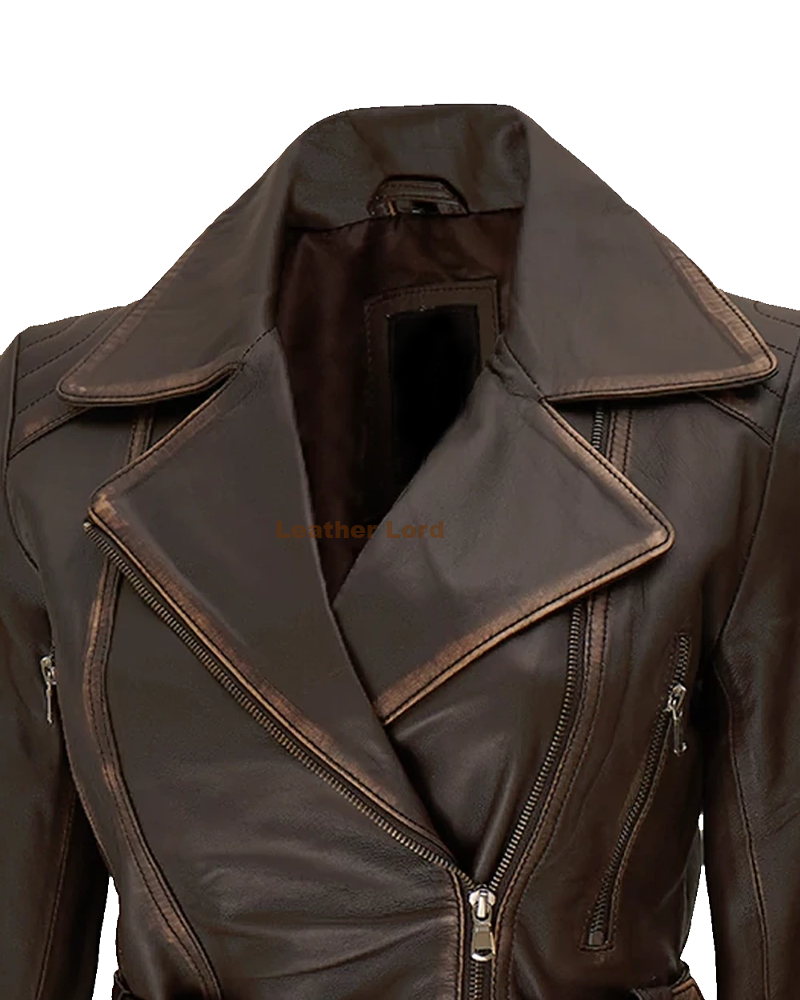 The Women’s Distressed Brown Long Biker Leather Jacket doesn’t just look great—it’s also incredibly functional. With multiple pockets, including two side zipper pockets, it allows you to keep your essentials close by. The zipper closure ensures a secure fit, while the adjustable cuffs provide additional flexibility. It’s the perfect jacket for anyone who needs style and practicality in one.
